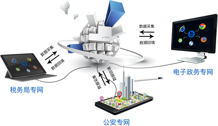 数据舰客户端:安装在需要数据采集与回填的办公电脑上,按照工作规则采集和回填浏览器中的数据。
