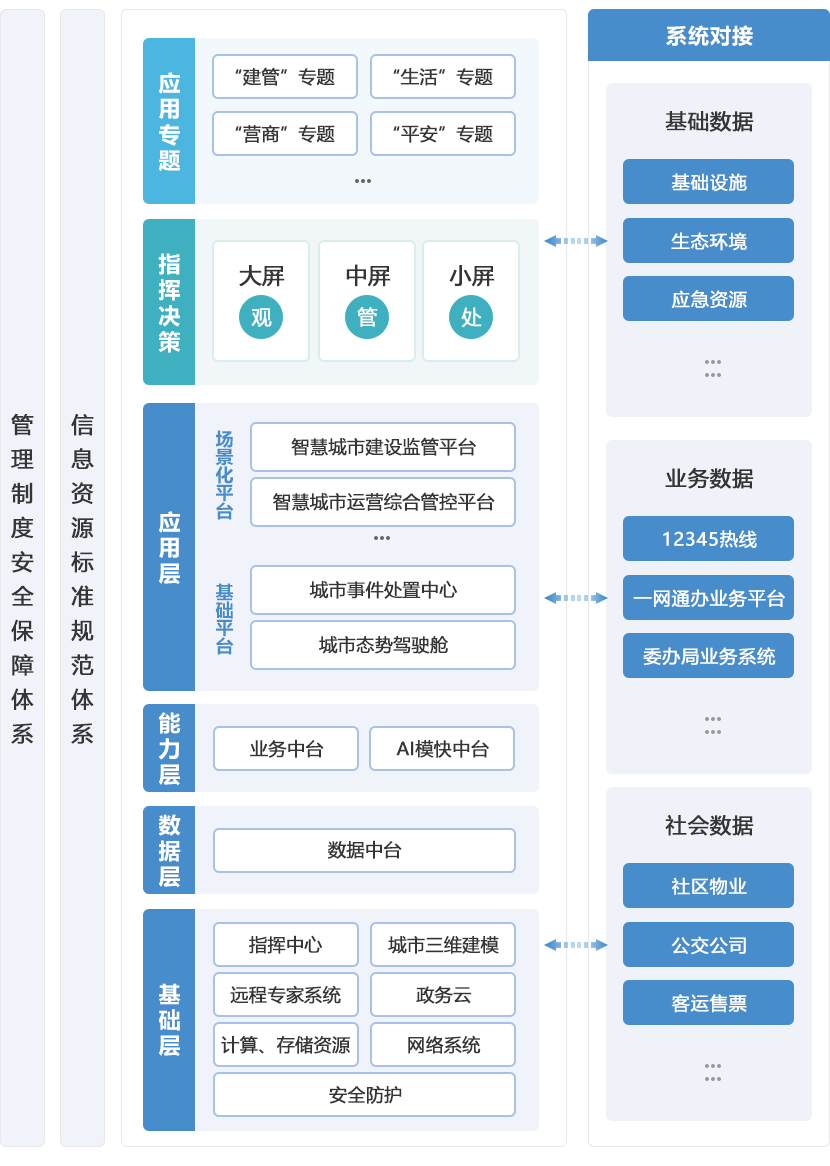 通过整合城市的“运、管、服”能力,构建具有“决策中枢、指挥中枢、治理中枢”职能的城市智能核心,基于三屏联动、多中心合一,实现决策指挥中心、各专业管理部门与政府之间的资源共享、信息互通、协同工作、协同督办。以资源整合、服务融合的理念引领城市经济、政治、文化、社会、生态文明建设,推进城市治理体系和治理能力现代化。