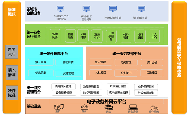 综合运用大数据、人工智能等新兴技术,推进综合类自助服务终端建设,以高实用、跨平台为核心打造自助服务一体化平台,实现集成服务、只跑一次、一次办成。自助服务一体化平台由统一业务运行前台、统一硬件适配中台、统一服务支撑中台和统一监控管理后台组成,具体架构如下图所示: