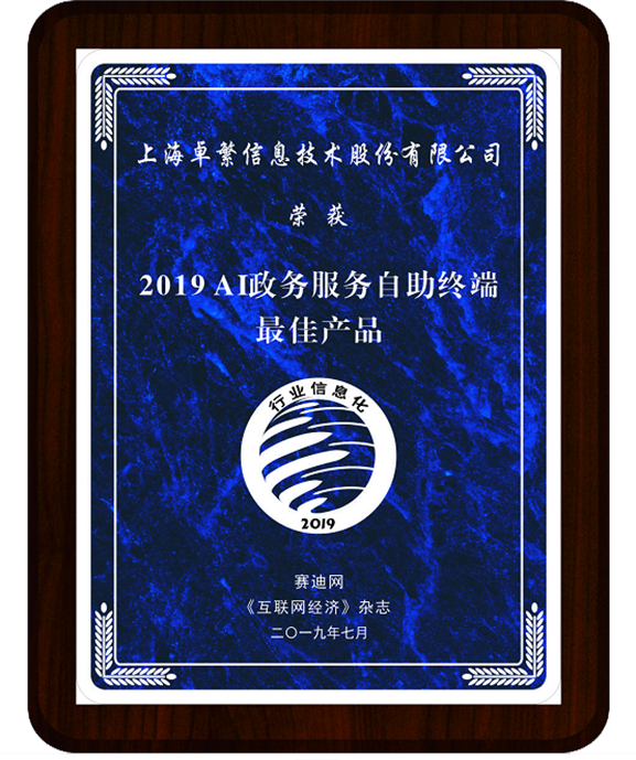 上海卓繁信息技术股份有限公司凭借不断突破的创新精神、强劲的发展势头和雄厚的技术实力,在“2019行业信息化技术创新发展峰会”中荣膺“2019智慧政务标杆企业”奖和“2019AI政务服务自助终端最佳产品”奖。