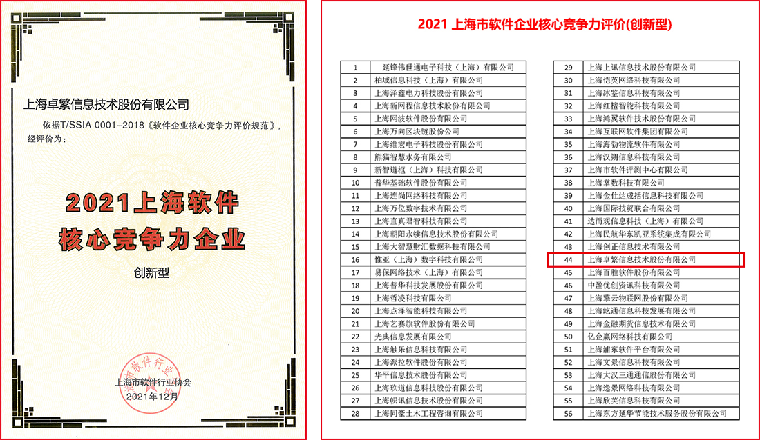 日前,协会正式公布了2021上海软件企业核心竞争力评价结果。上海卓繁信息凭借在技术创新、软件研发以及应用等方面的卓越表现,荣获“2021上海市软件核心竞争力企业