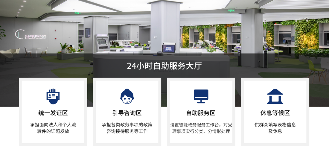 24小时自助服务大厅共设置四个工作区:统一发证区,承担面向法人和个人流转件的证照发放;引导咨询区,承担各类政务事项的政策咨询、接待服务等工作;自助服务区,设置智能政务服务工作台,对受理事项实行分类、分情形处理;休息等候区,供群众填写表格信息及休息。