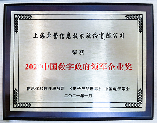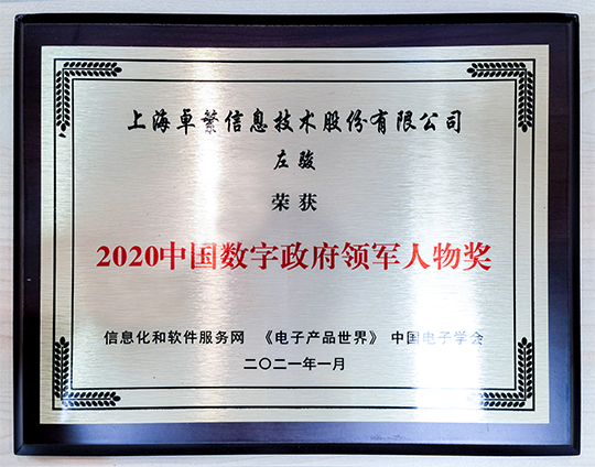 于大会现场发布《数字政府优秀项目》。卓繁信息荣获2020中国数字政府领军企业奖,同时,卓繁信息董事长左骏先生获2020中国数字政府领军人物奖。