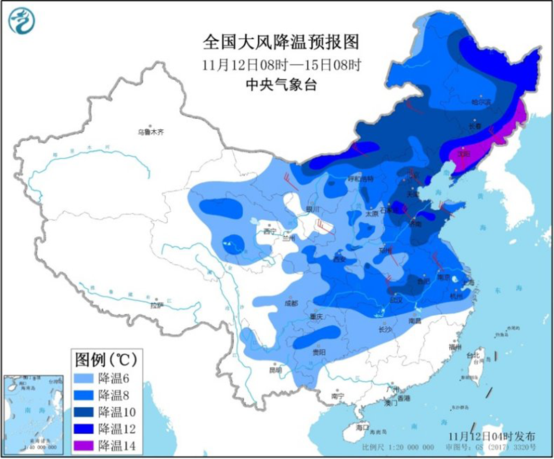 受强冷空气影响,我国中东部地区将出现大风降温天气;黑龙江东南部、吉林东部、辽宁中东部降温降到发紫;西北、华北、西南等地气温将下降6~8℃!