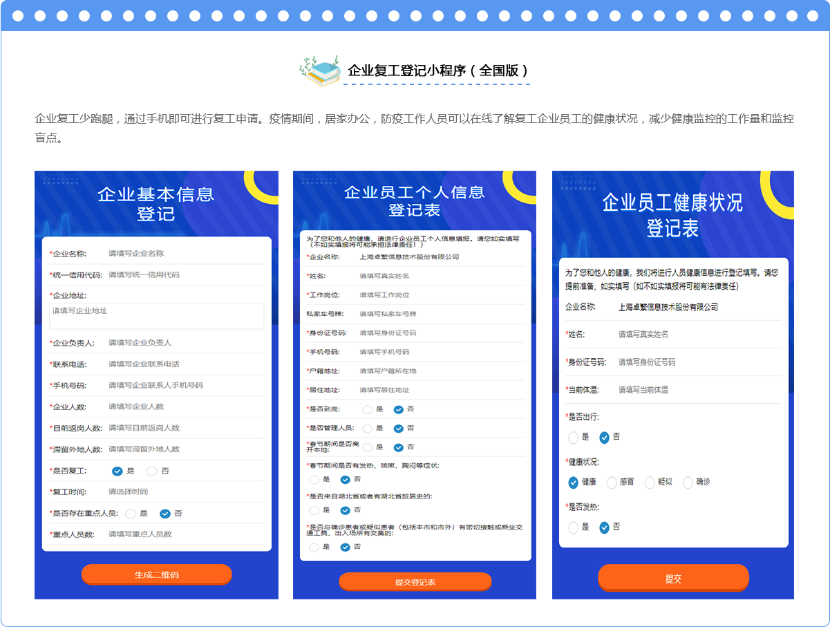 与此同时,卓繁信息将上线全国版的疫情防控产品、企业复工登记、居民健康登记、无接触式咨询……
