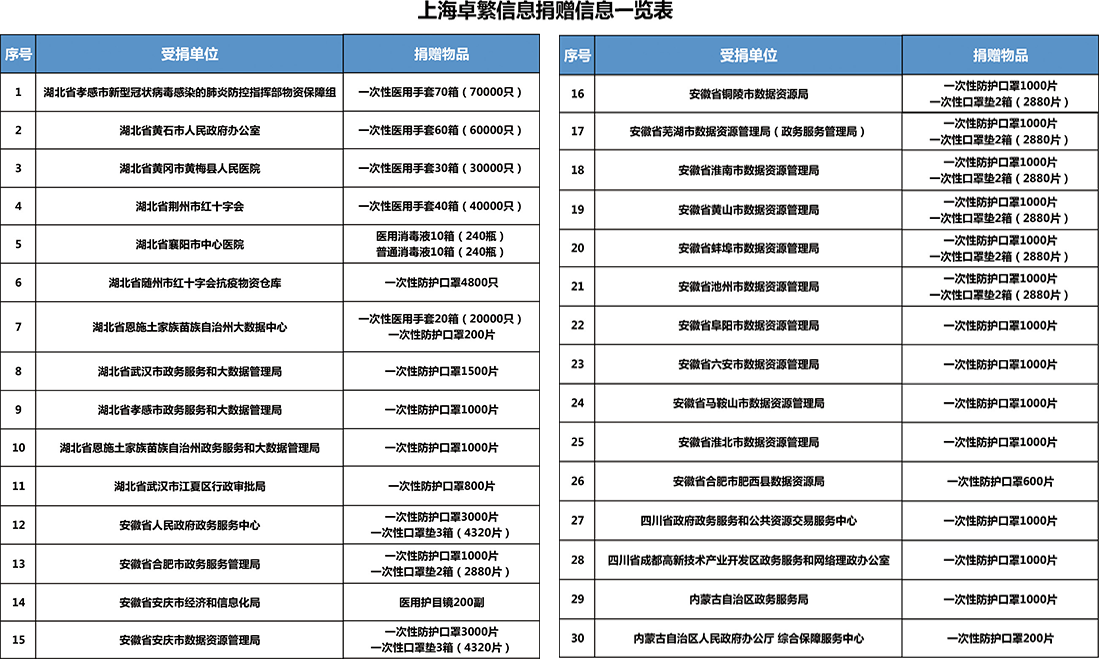 武汉疫情的突然爆发,让我们再一次见证了中华儿女守望相助、勇毅担当的一面。疫情期间,一批又一批的逆行者迎难而上,奔赴抗“疫”一线;无数的防控物资从各个方向涌向疫区,大家以爱为盾,筑起防护墙。此间,卓繁信息也向湖北等地提供物资捐赠,为抗击疫情贡献自己的力量。